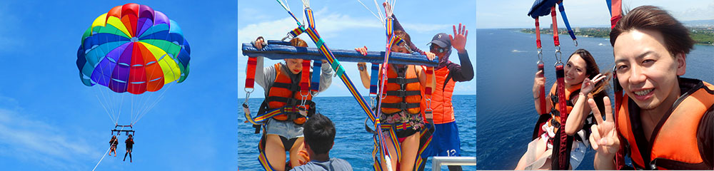 上空からセブの美しい海や近くの島々を眺めることのできるパラセーリング。ボートから足が離れると、あっという間に数10mの高さまで到達します。空から見る景色はまた格別!
